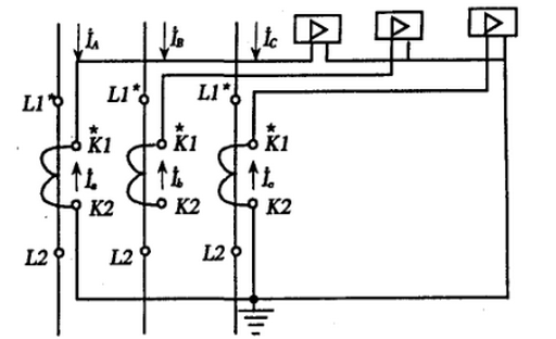 三相式完全星形接线方式如图所示,这种方式对各种故障都起作用。当故障电流相同时,对所有故障都同样灵敏,对相同短路动作可靠,至少有两个继电器动作,因此主要用于高压大电流接地系统以及大型变压器、电动机的差动?;?、相间短路保护和单相接地短路?;ず透汉梢话悴黄胶獾娜嗨南咧葡低?,也用在负荷可能不平衡的三相三线制系统中,作三相电流、电能测量